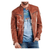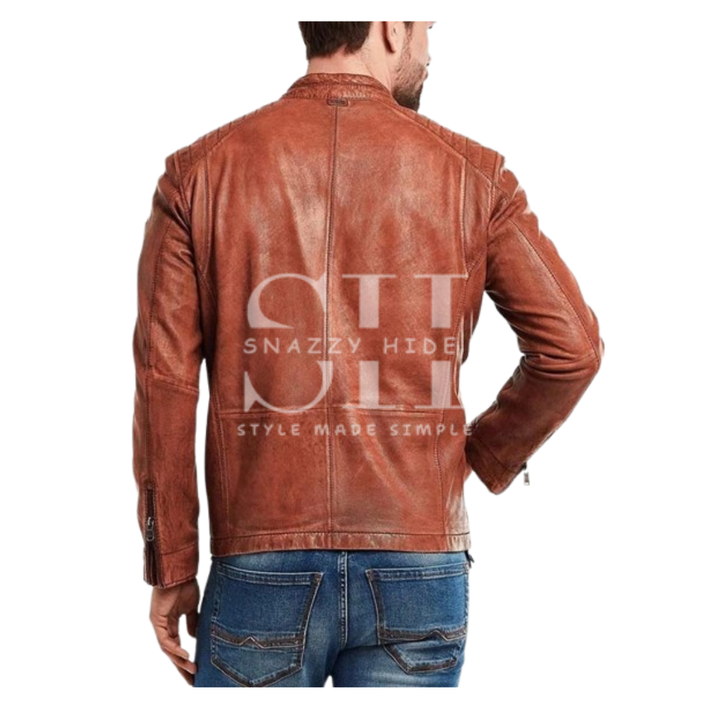 - Design: Brown leather biker jacket featuring a unique "crinkle" or textured leather finish for added character.