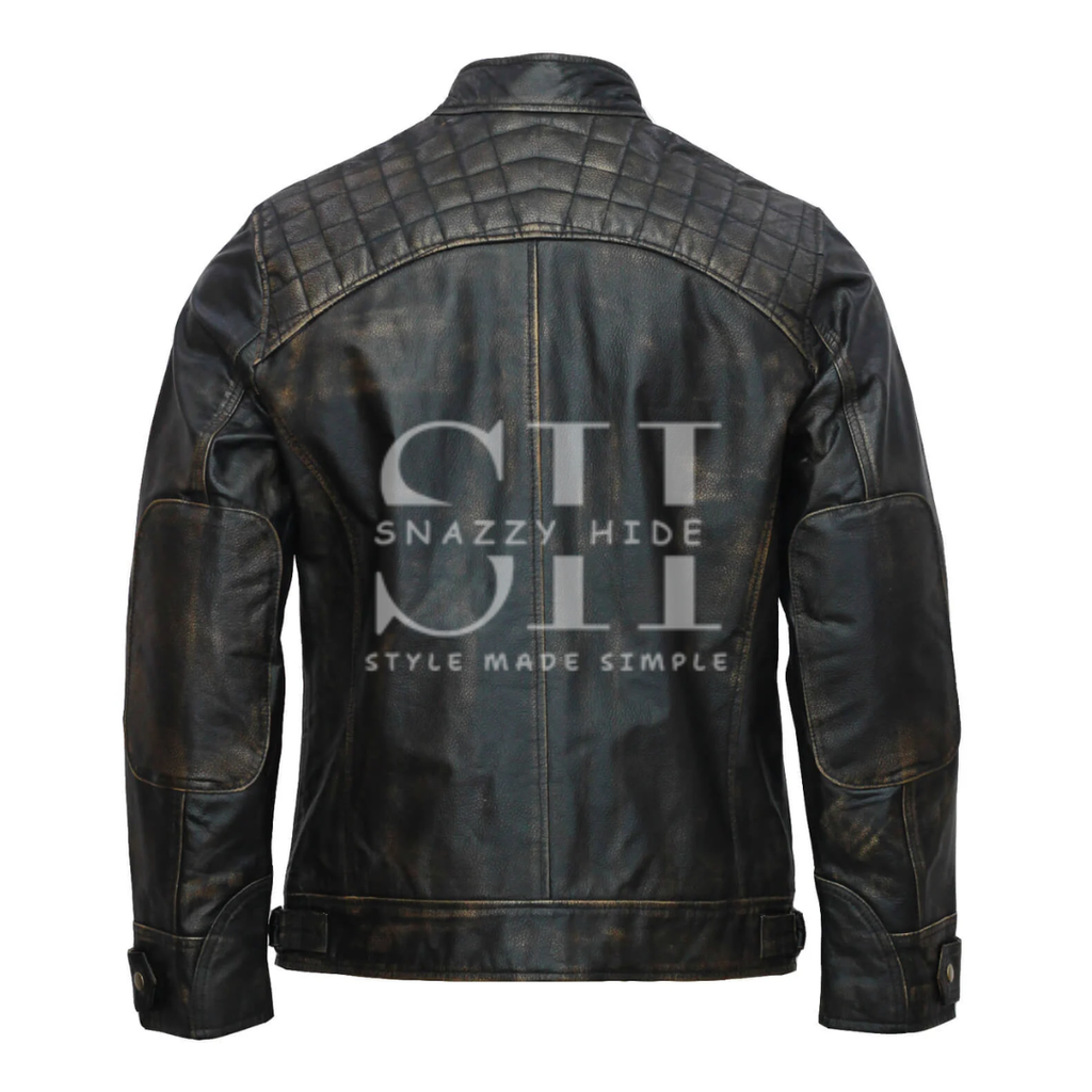 • Design: Rugged black motorcycle jacket with a purposefully worn, vintage-inspired finish.
