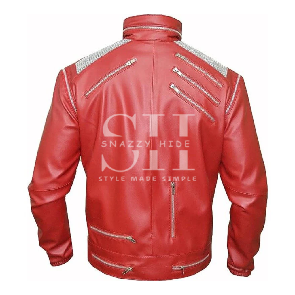 • Design: Iconic red and black leather jacket with zippered details and a bold, rebellious rock aesthetic from the Thriller era.