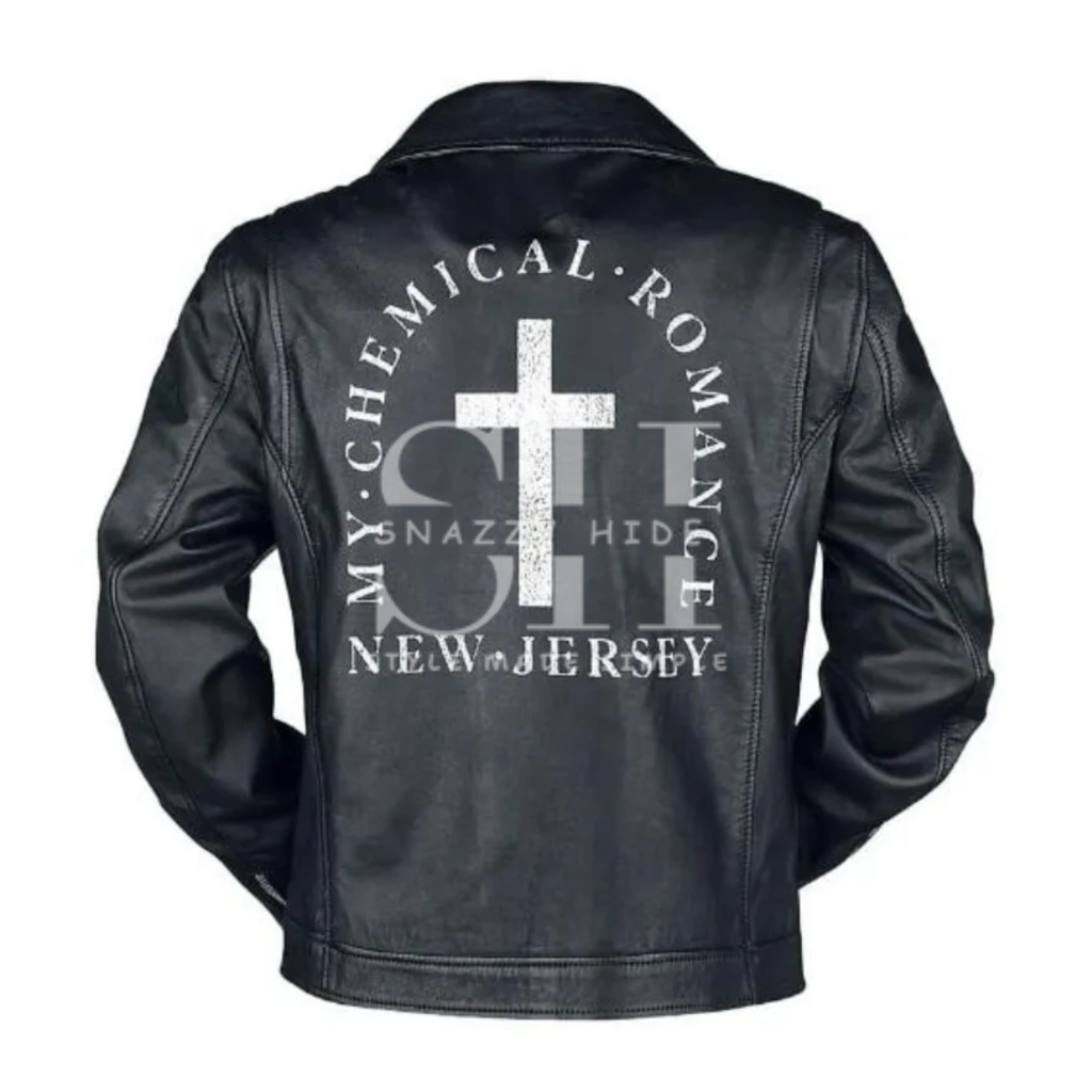 Declare your allegiance to the sound of rebellion with the MCR NJ Cross Black Moto Jacket, a piece that embodies the raw, iconic energy of My Chemical Romance. Featuring the band’s signature New Jersey cross emblem emblazoned across the back, this jacket fuses classic motorcycle attitude with the unmistakable aesthetic of one of rock’s most legendary acts. Built from heavy-duty black leather and cut with a sharp, rock-ready silhouette, it’s a wearable tribute for those who lived through the Black Parade and carry the spirit with them still.