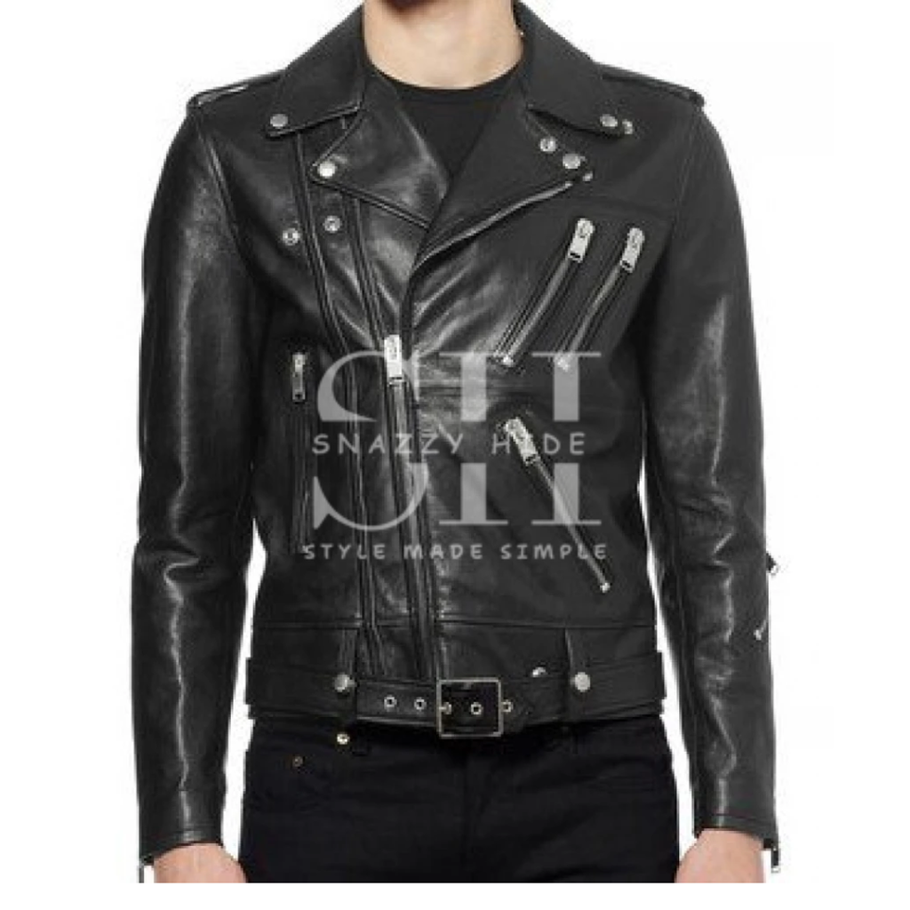 - Design: Sleek black leather biker jacket with an adjustable belted waist for a tailored, rugged look.