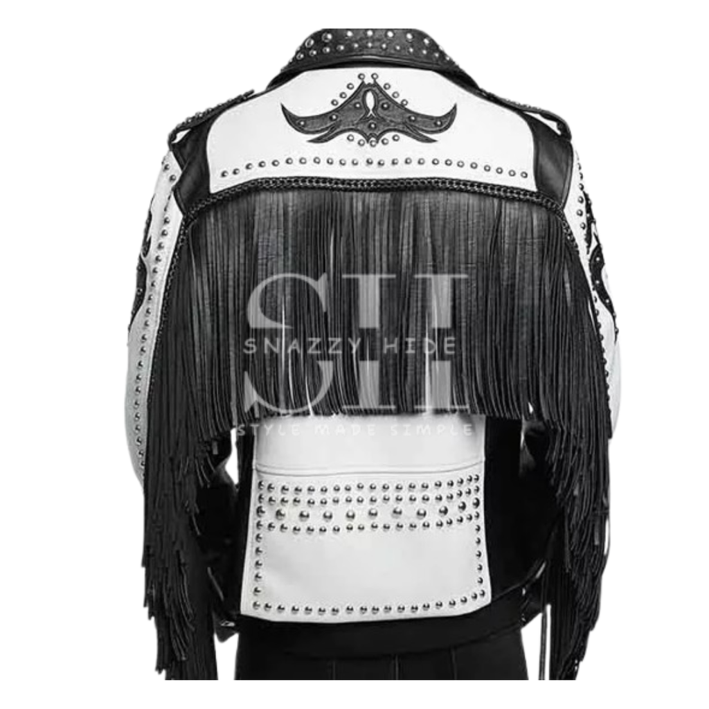 - Design: Maximum-impact jacket combining biker style with fringe, studs, rivets, and tribal/punk-inspired detailing.