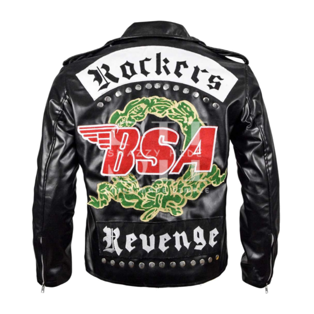 • Design: Bold, statement leather jacket featuring the iconic BSA (Birmingham Small Arms) and Faith Rockers Revenge motorcycle club patches and colors.