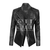 - Design: A sleek, body-hugging black leather jacket with a minimalist racer or café racer collar, emphasizing speed and style.