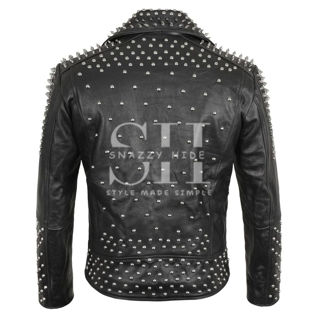 • Design: Edgy black leather biker jacket adorned with metal studs for a bold, rock-and-roll aesthetic.