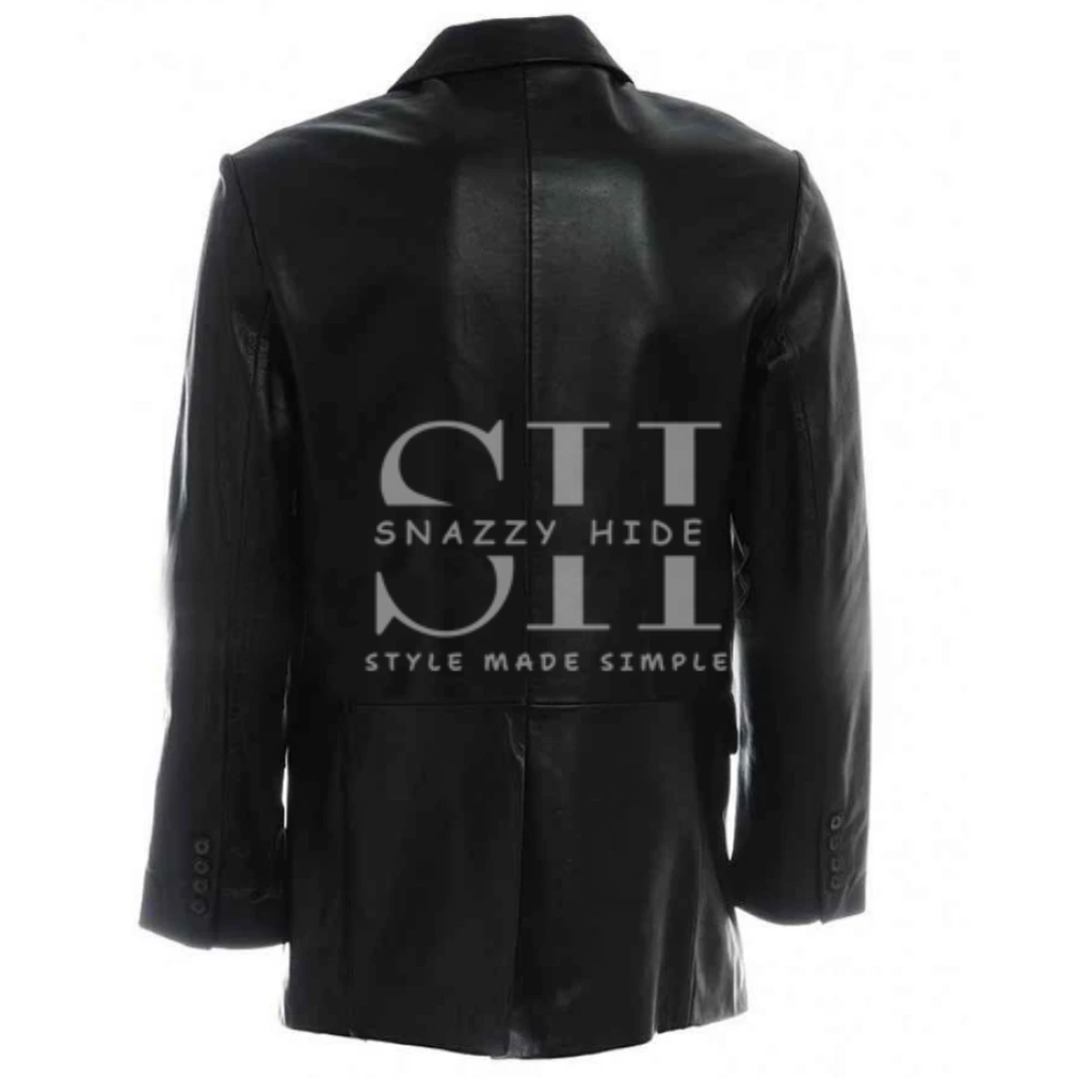 • Design: Sophisticated leather jacket with a clean, blazer-like front featuring three buttons for a polished look.