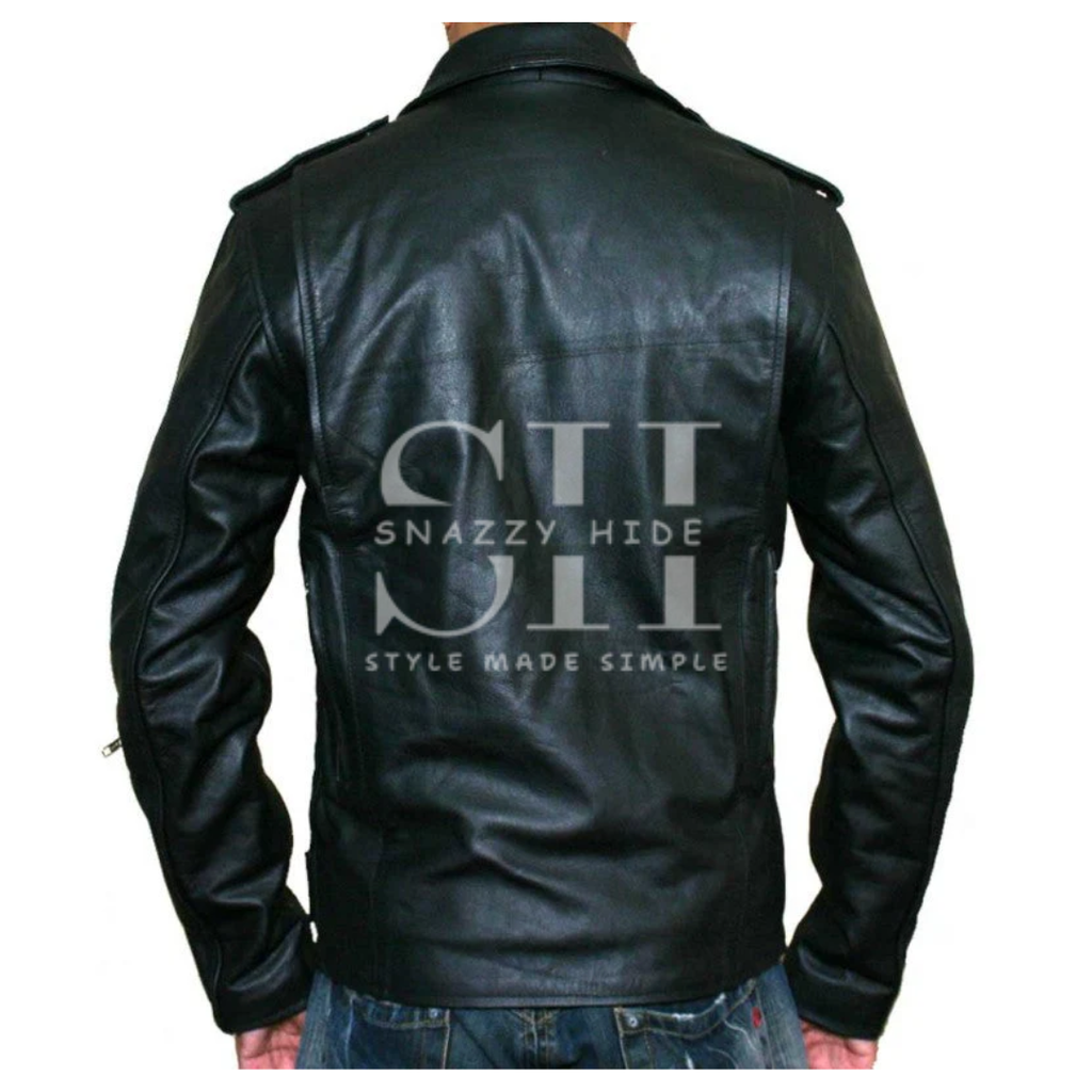 Become the iconic protector of mankind with the T-800 Guardian Leather Jacket, the exact style worn by Arnold Schwarzenegger in Terminator 2: Judgment Day. This piece is more than a jacket—it's a slice of cinematic history, immortalizing the moment the ultimate killing machine became the ultimate guardian. Featuring the signature distressed black leather, silver buckle-and-strap shoulder detail, and sunglasses-ready collar, it delivers the rugged, cybernetic cool that defined an era of action heroes and heroic machines.
