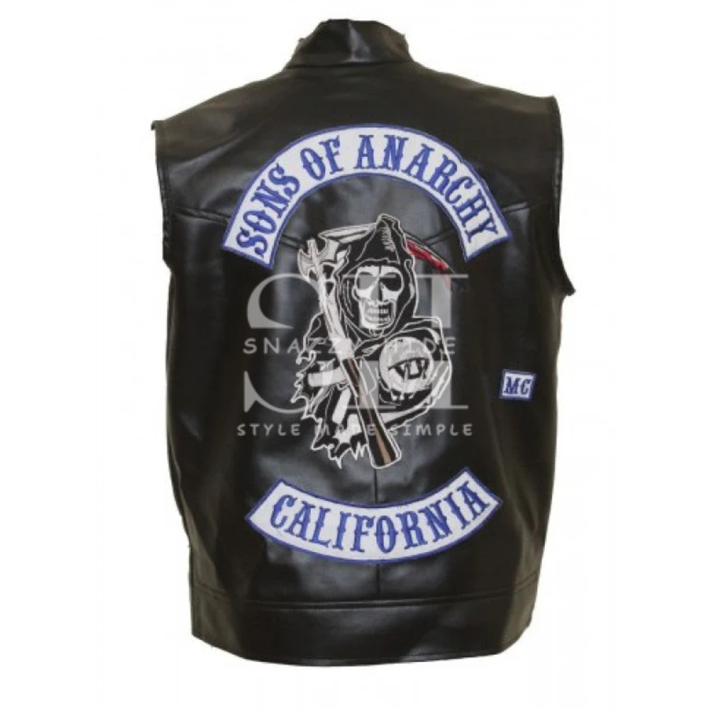- Design: Classic cut-off biker vest with official SOA patches/club rockers