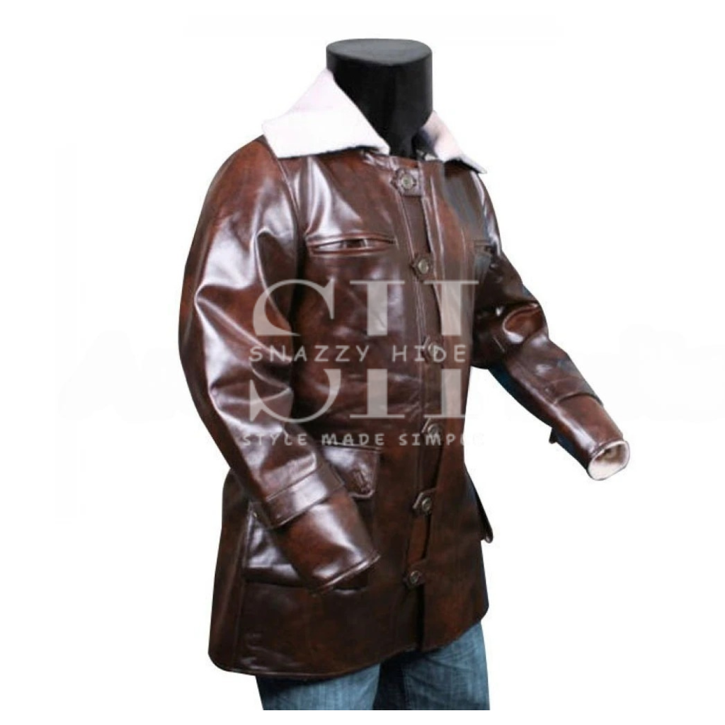 Crafted from premium, distressed leather or heavy-duty technical fabric, this bomber-style coat features a robust, muscular fit, a wide shawl collar, and a signature front zipper reminiscent of military and utilitarian design. The weathered finish, reinforced stitching, and functional pockets reflect Bane’s rugged, no-nonsense aesthetic, making it a standout piece for collectors and cosplay enthusiasts alike.