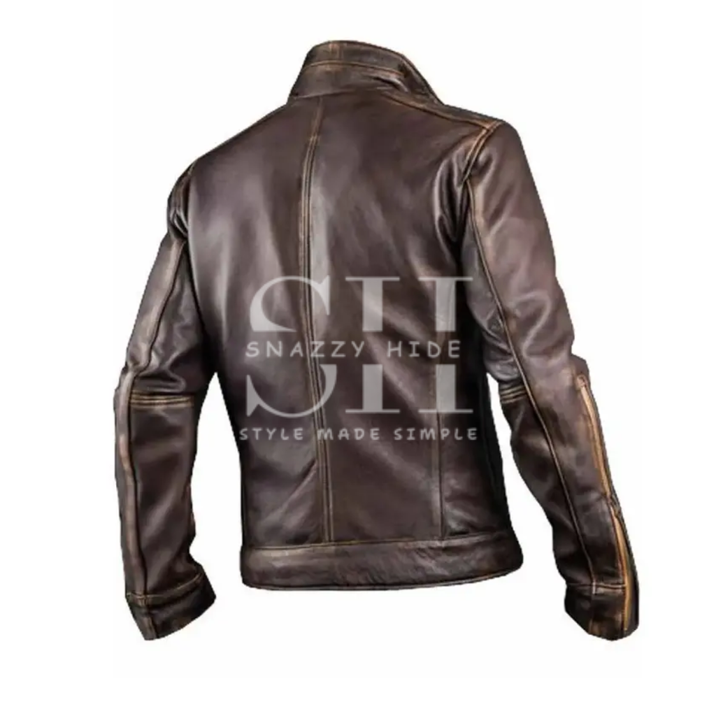 - Design: Slim-fit brown leather café racer jacket with a vintage, worn-in finish and minimalist collar.