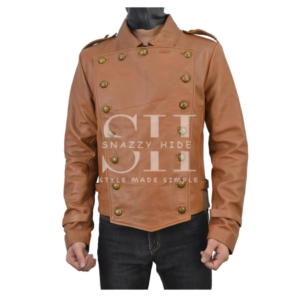 • Design: Vintage 1930s-style brown leather jacket with an Art Deco-inspired silhouette.