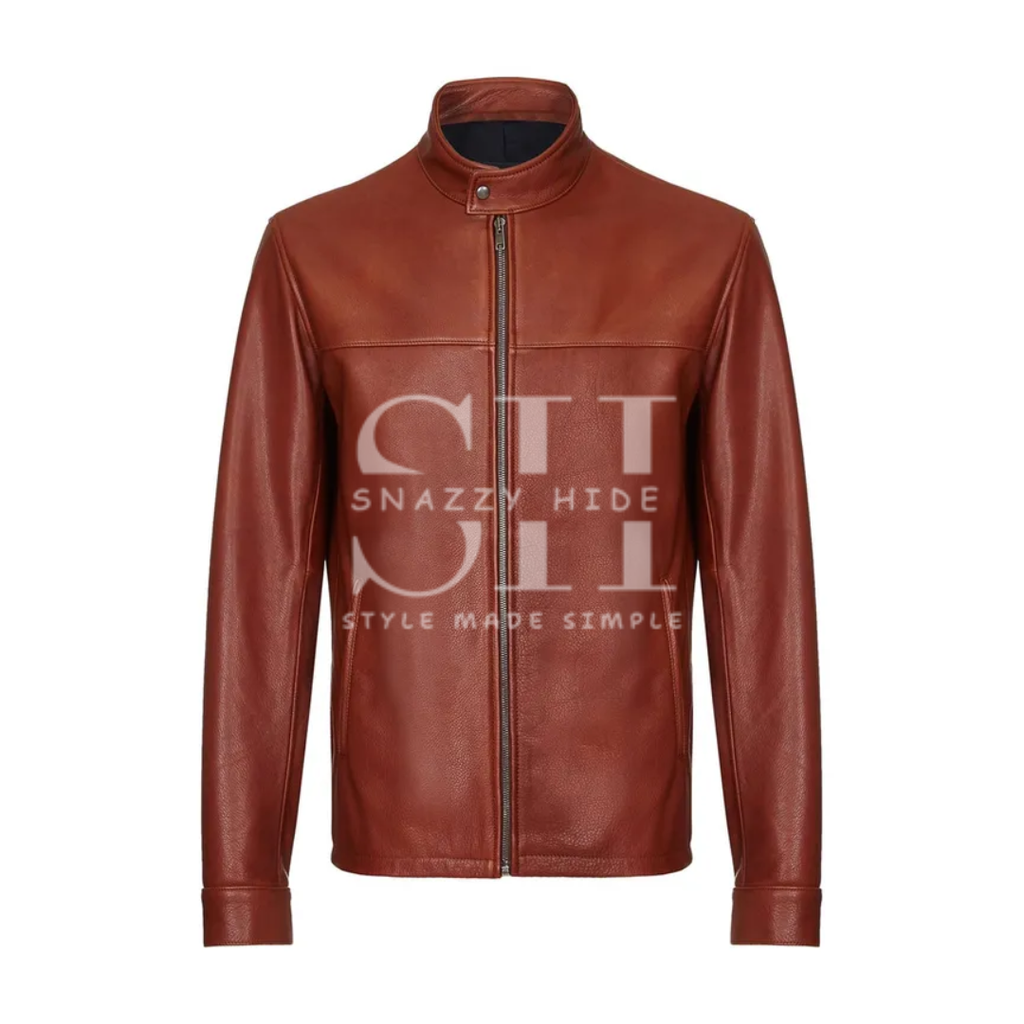 • Design: A sleek, minimalist leather jacket in a rich dark brown, featuring the classic café racer collar and a slim, retro fit.
