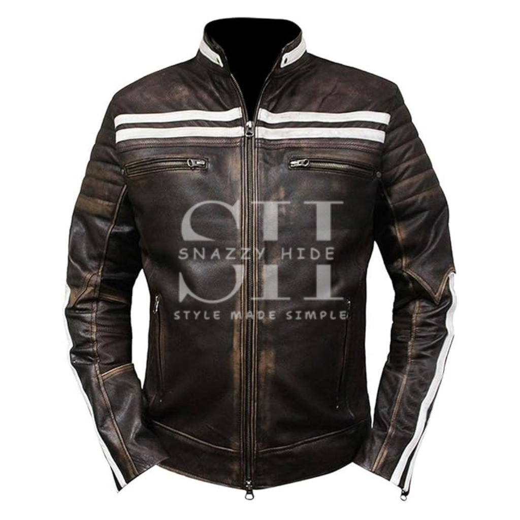 - Design: Classic café racer jacket in rich brown leather, featuring a minimalist collar and a slim, retro silhouette.