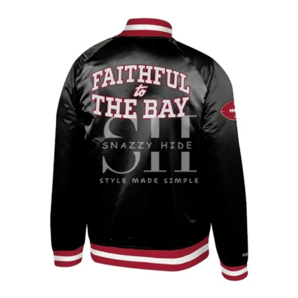 Represent the legacy with pride in the Faithful to the Bay 49ers Jacket, a tribute to the unbreakable bond between a team and its city. This premium black jacket is built for the true believer, featuring bold team graphics, iconic colors, and the defiant spirit of the San Francisco 49ers woven into every seam. It’s more than fan apparel—it’s a statement of loyalty, designed for those who stand by their team through every season, on and off the field.