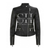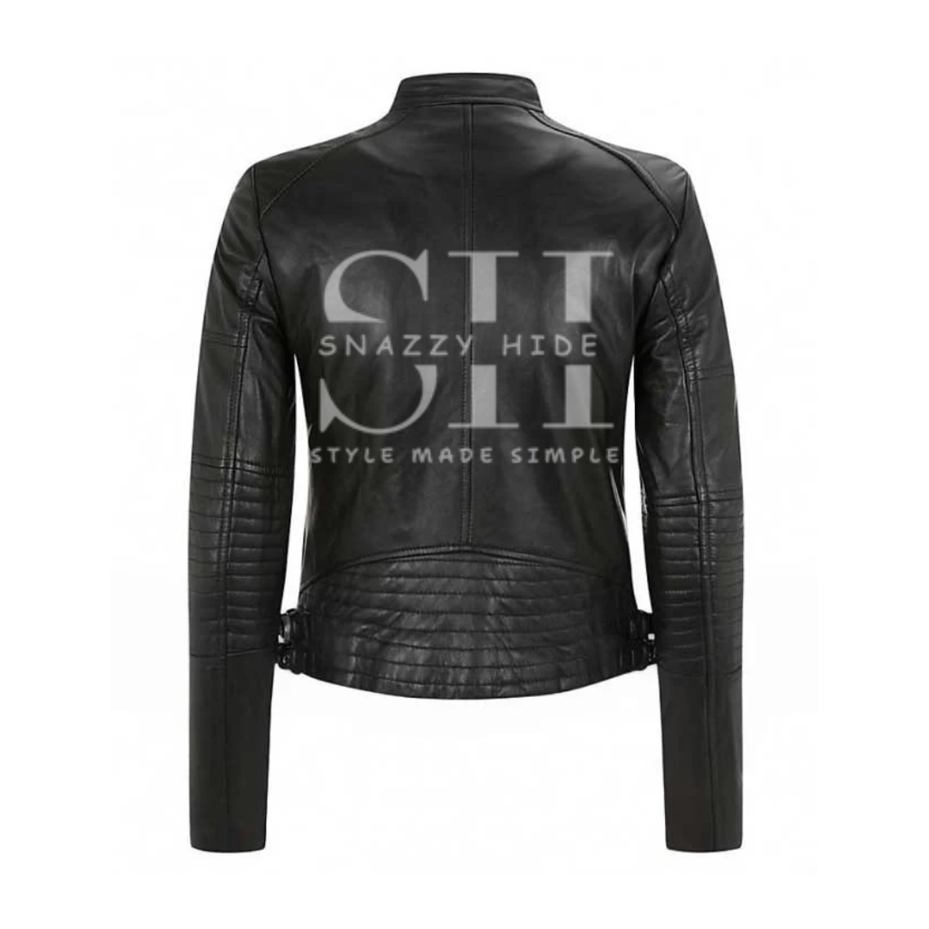 • Design: Short, waist-length black leather jacket with a modern, feminine fit.