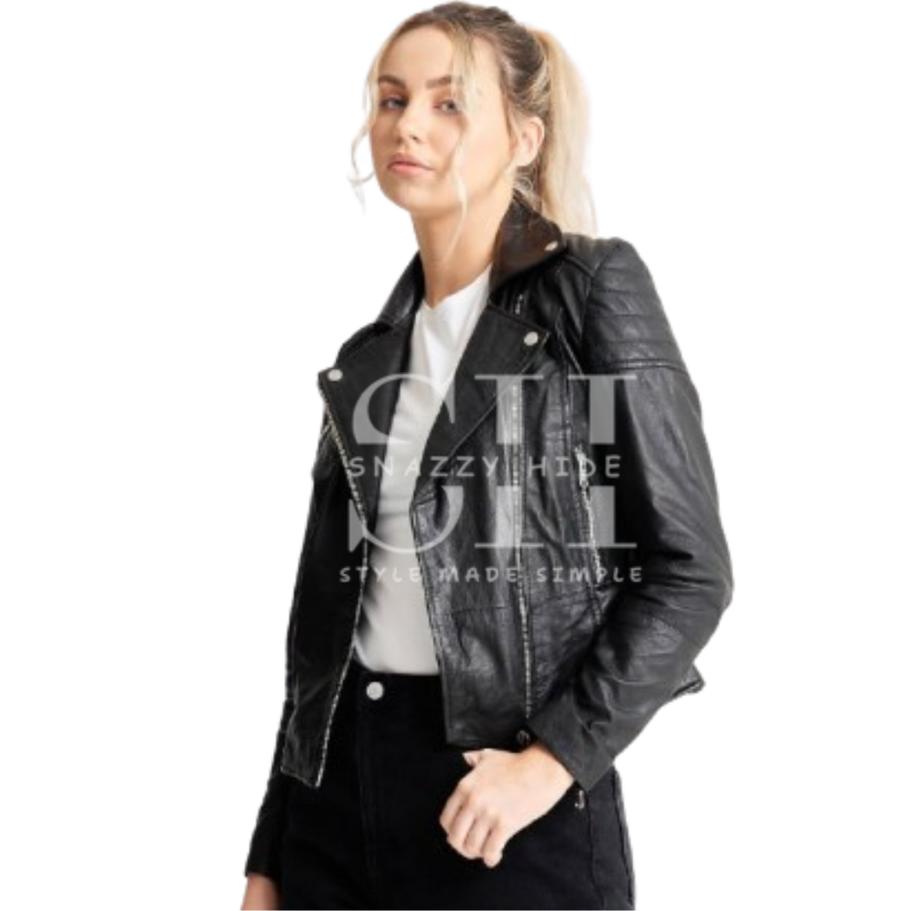 • Design: Classic motorcycle-style jacket with a full front zip, tailored for a feminine fit.