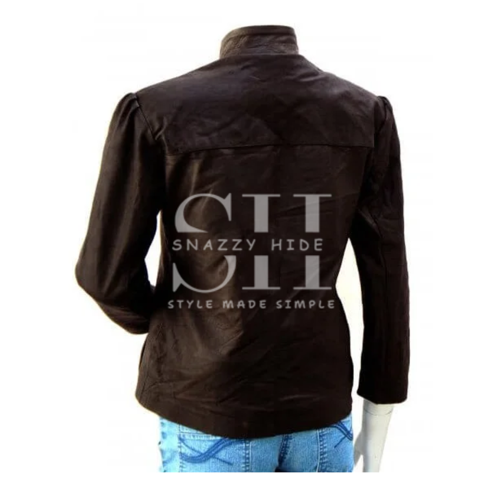 Its rich brown shade keeps the look classy and versatile, while the front zip closure, structured fit, and full-length sleeves ensure a flattering silhouette. Finished with functional pockets and durable stitching, this jacket is perfect for casual outings, biker looks, or statement streetwear.